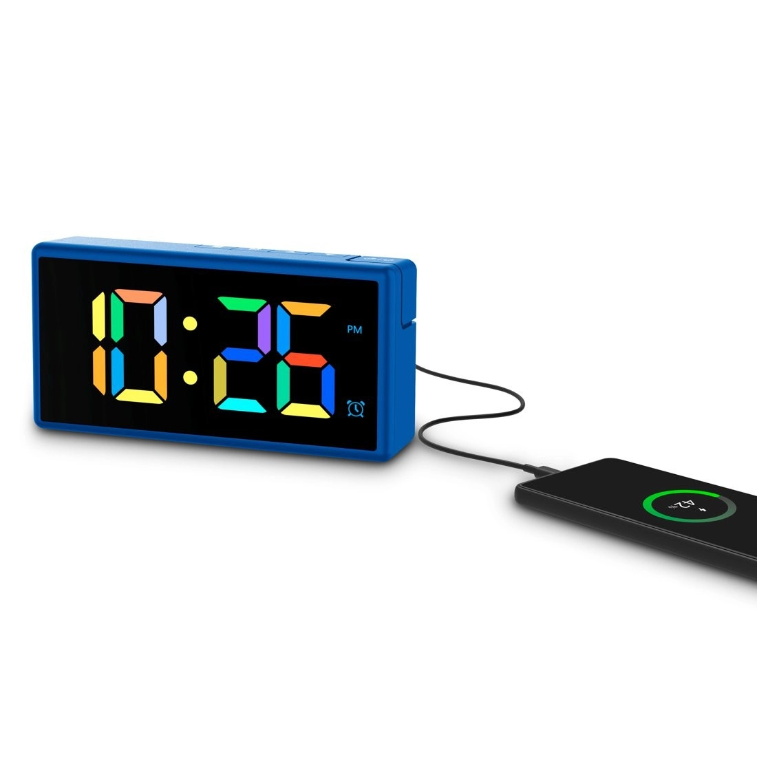Le réveil Hama Ibiza bleu allie style et praticité avec un grand écran LED multicolore, très lisible, une alarme programmable avec snooze, le choix du format 12/24 h et un port USB 1 A pour recharger votre téléphone. Grâce à 4 niveaux de luminosité, dont extinction totale pendant la charge et au choix de la couleur des chiffres (blanc, bleu, vert, rouge, dégradé), il s’adapte parfaitement à toute chambre.