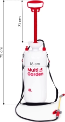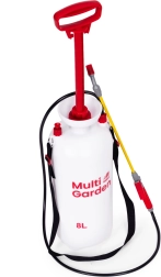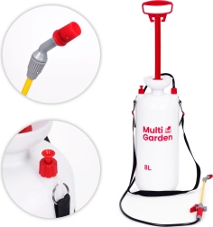 Pulvérisateur pratique sous pression de 8 l de la marque MULTIGARDEN pour l’entretien confortable du jardin et le nettoyage autour de la maison. Il offre une buse réglable (jet plat et cône), une longue lance en fibre de verre, une pompe à piston, une valve de sécurité et une échelle graduée sur le réservoir. Grâce à sa poignée ergonomique et à sa sangle réglable, le pulvérisateur est facile à porter et à utiliser.
