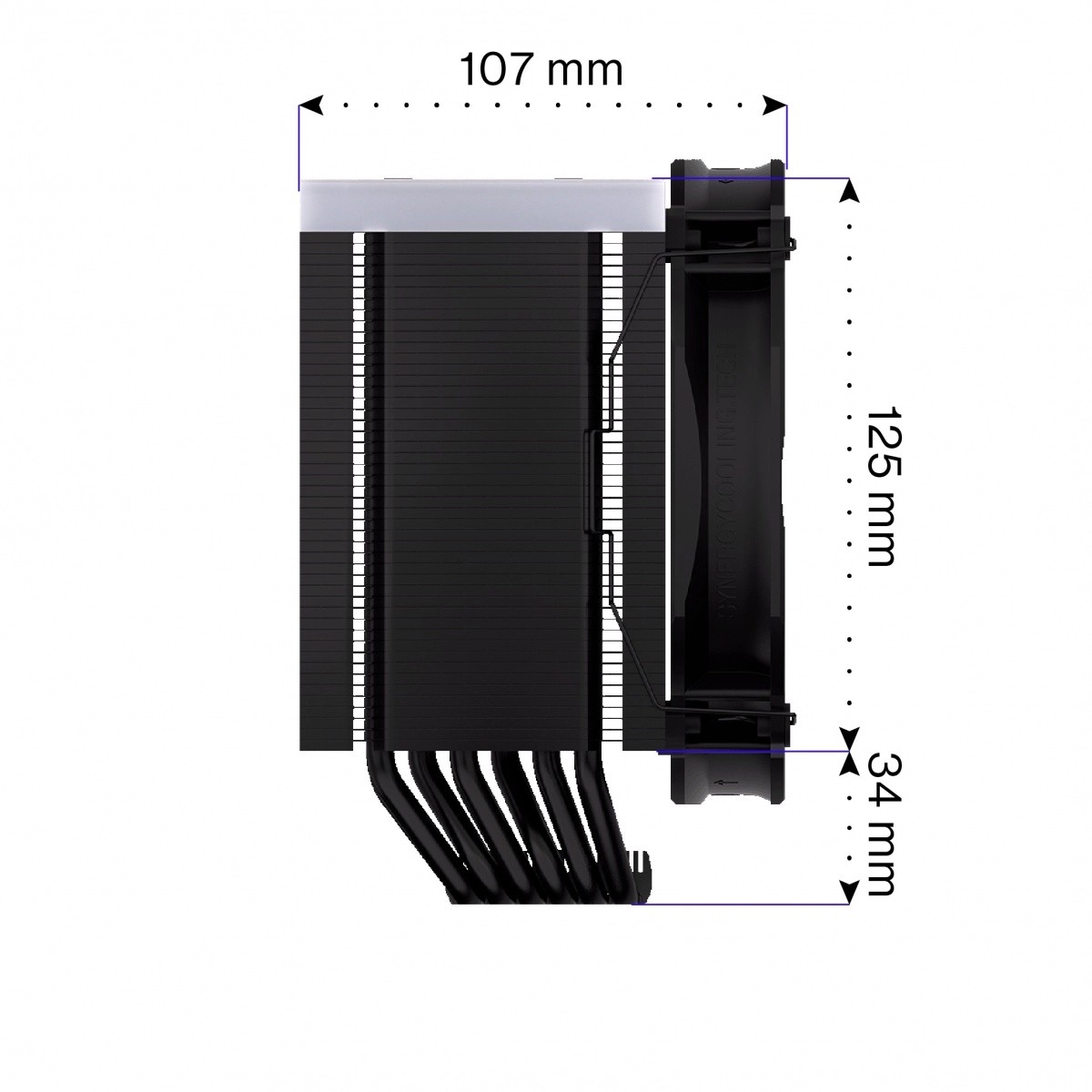 - Performance de refroidissement optimale : Le radiateur à ailettes denses avec six caloducs évacue efficacement la chaleur du processeur. Optimisé pour un flux d’air unidirectionnel, il offre le meilleur refroidissement de sa catégorie.