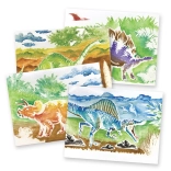 • Planches aquarelle magiques avec motifs de dinosaures révélant des détails lors de l’application d’eau et de couleur.