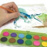 12 peintures aquarelles, 5 planches aquarelle magiques, 2 pinceaux, instructions, carte de collection dinosaure