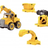 - 4 véhicules (grue, bétonnière, benne, pelleteuse), tournevis avec 3 embouts