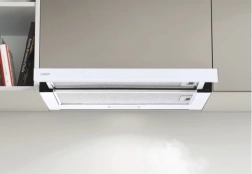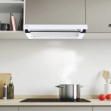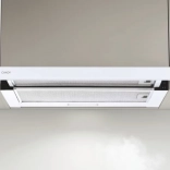 Hotte télescopique de couleur blanche, idéale pour les cuisines modernes. Elle élimine efficacement les vapeurs et les odeurs pendant la cuisson grâce à un système de filtration de qualité et à un faible niveau sonore.