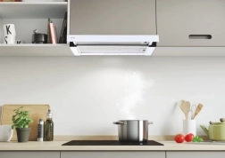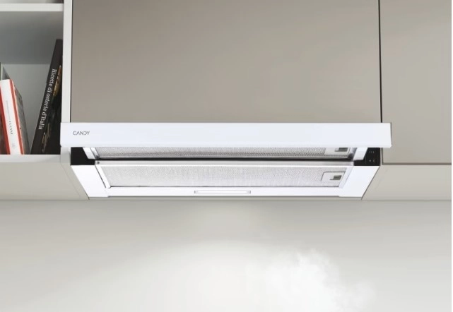 La hotte télescopique au design blanc et stylé s’intègre parfaitement dans toute cuisine moderne.