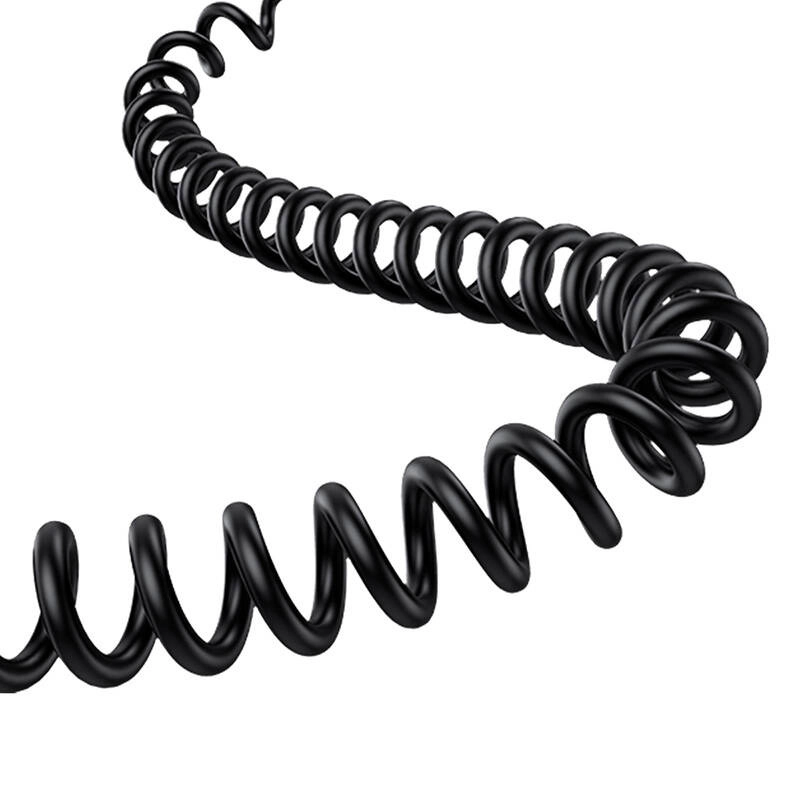 Le câble Lightning 1,4 m en spirale maintient l’habitacle ordonné et atteint facilement les sièges arrière. Le port USB‑C ajoute la possibilité de charger un second appareil simultanément.