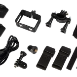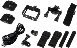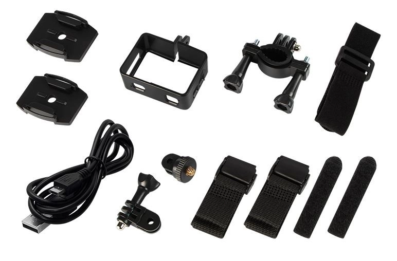 La boîte comprend des supports pour casque et guidon, un support cadre, des fixations adhésives, des sangles et un câble USB – tout pour un montage rapide et sûr sur le terrain. Le boîtier étanche permet de filmer sous l’eau jusqu’à 30 m.