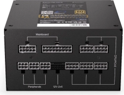 La haute efficacité est confirmée par la certification 80 PLUS Gold – moins de pertes, moins d’échauffement et une plus grande longévité. Le fonctionnement silencieux est assuré par un ventilateur Fluctus 120 mm avec roulements FDB et optimisation psychoacoustique. La fiabilité est renforcée par des condensateurs japonais haut de gamme (105 °C) et un ensemble complet de protections OVP/UVP/OCP/OPP/SCP/OTP.
