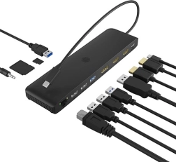 Station d’accueil USB‑C 12‑en‑1 compacte et performante qui étend votre ordinateur portable avec une triple sortie vidéo, un réseau Gigabit rapide, plusieurs ports USB et des lecteurs de cartes. Idéale au bureau comme en déplacement – connectez tout avec un seul câble et travaillez efficacement sans limites.