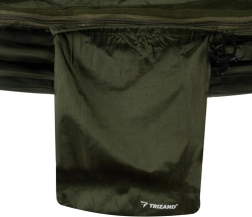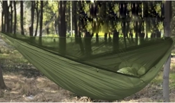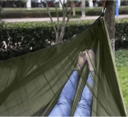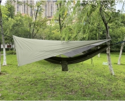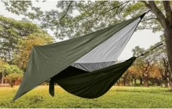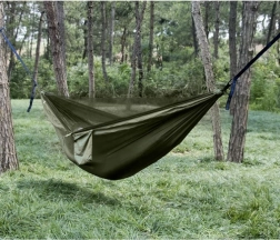 Le hamac est équipé d'une bâche tarp, offrant une protection contre les rayons UV, la pluie et la rosée. La moustiquaire sert de protection efficace contre les moustiques et autres insectes, tout en permettant une bonne circulation de l'air. Une poche pratique permet de ranger des petits objets comme un téléphone ou des livres à portée de main.