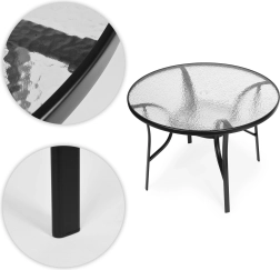 La structure en acier robuste avec finition thermolaquée et double renfort sous le plateau garantit une grande stabilité, même sous charge plus importante ou lors de l’utilisation d’un parasol. Les embouts antidérapants protègent le sol des rayures. La table offre un espace confortable pour le café, les grillades et les repas en famille jusqu’à quatre personnes.