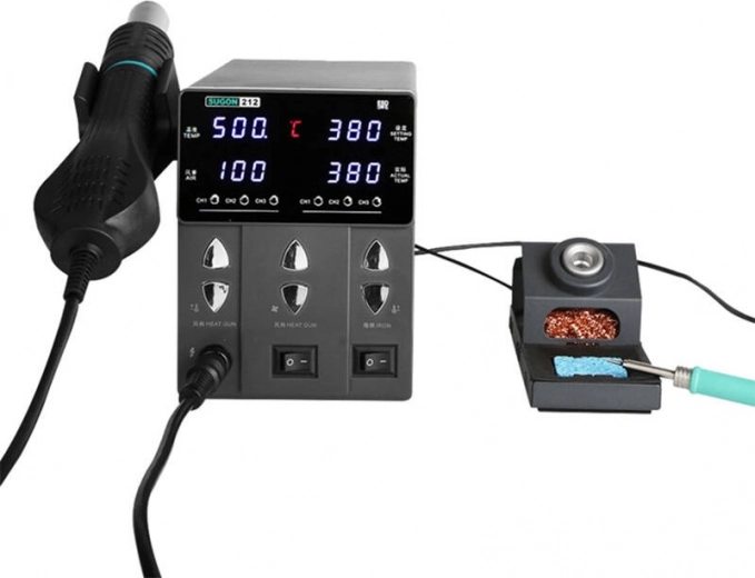 Sugon 212 combine une station à air chaud et un fer T12, ce qui en fait un outil complet pour la réparation et l’assemblage électroniques. Elle permet non seulement un soudage précis, mais aussi un dessoudage et un montage faciles des composants SMD. Trois boutons programmables vous permettent d’enregistrer les réglages optimaux de température et de débit d’air.