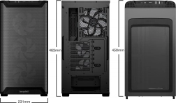 Malgré ses dimensions compactes, le boîtier accueille des cartes graphiques performantes, de grands refroidisseurs à air ainsi que des kits watercooling avec radiateurs jusqu’à 360 mm. Le montage vertical du GPU est également possible.