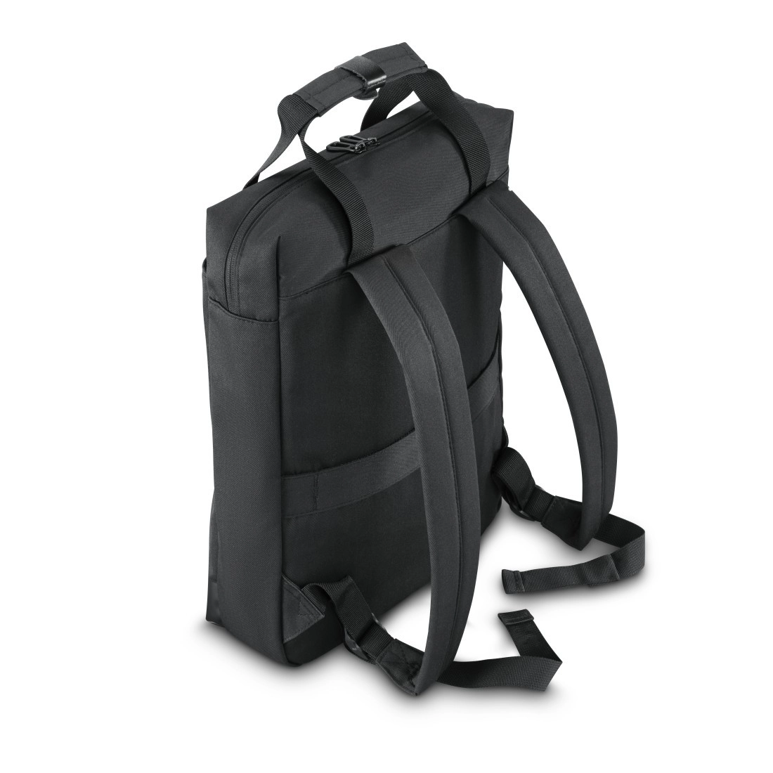 La poche avant avec organiseur garde câbles, téléphone et petits accessoires bien rangés. Le revêtement extérieur déperlant protège le contenu de l’humidité, tandis que les pieds antidérapants assurent la stabilité, évitent l’abrasion et servent d’amortisseurs supplémentaires. Grâce à la sangle pour fixation à une valise et au rembourrage des bretelles, ce sac à dos est parfait pour les voyages d’affaires comme pour la ville.