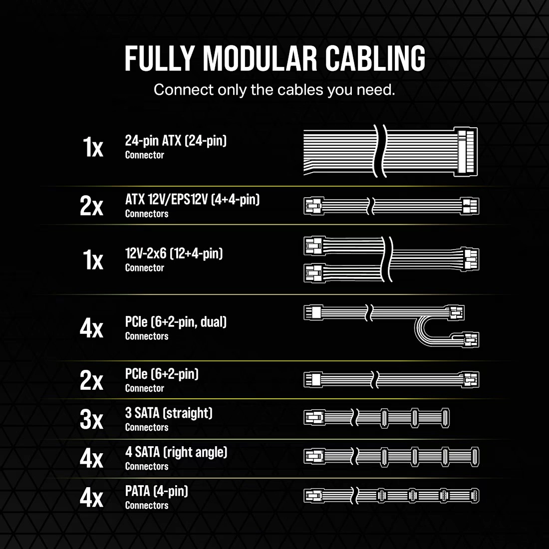 Ne branchez que ce dont vous avez besoin – cinq ports universels 8 broches couvrent l’alimentation des cartes mères modernes comme des GPU performants et facilitent la gestion des câbles.