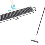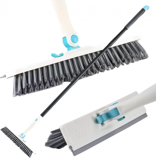Brosse de sol universelle 2‑en‑1 pour intérieur et extérieur, combinant des poils durs pour le récurage et une raclette intégrée pour un essuyage rapide sans traces. Grâce au long manche réglable et à la tête pivotante, vous atteignez facilement les coins, le long des murs et des rebords. Idéale pour salles de bains, terrasses, balcons, garages et cuisines.