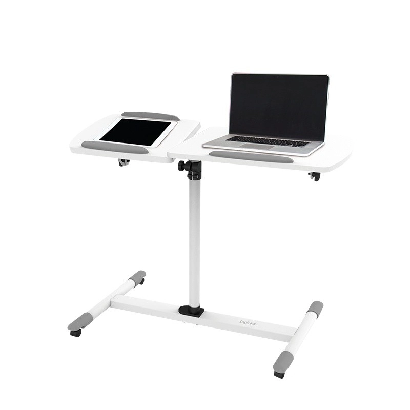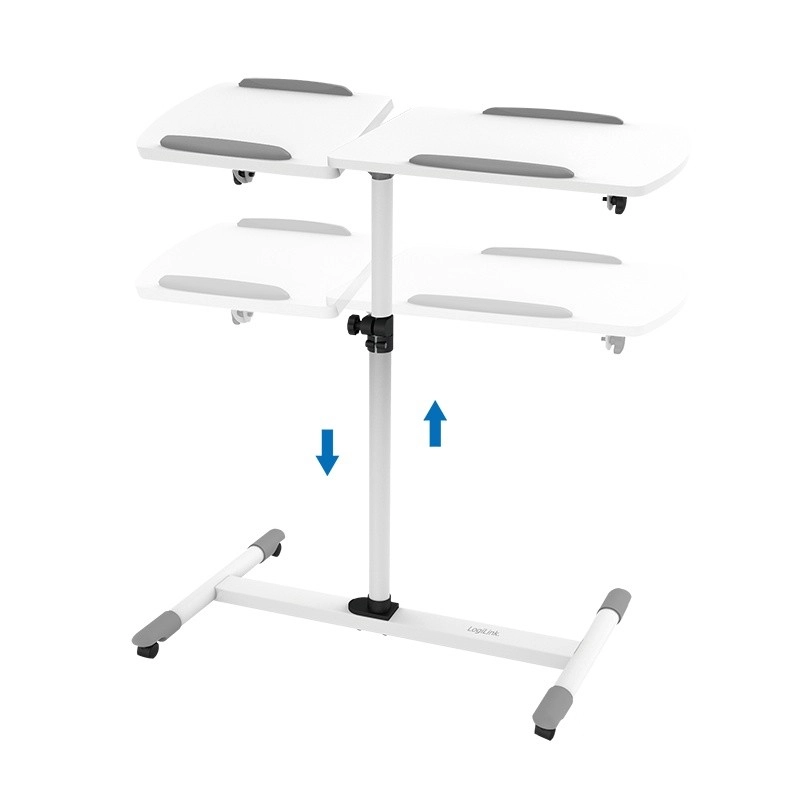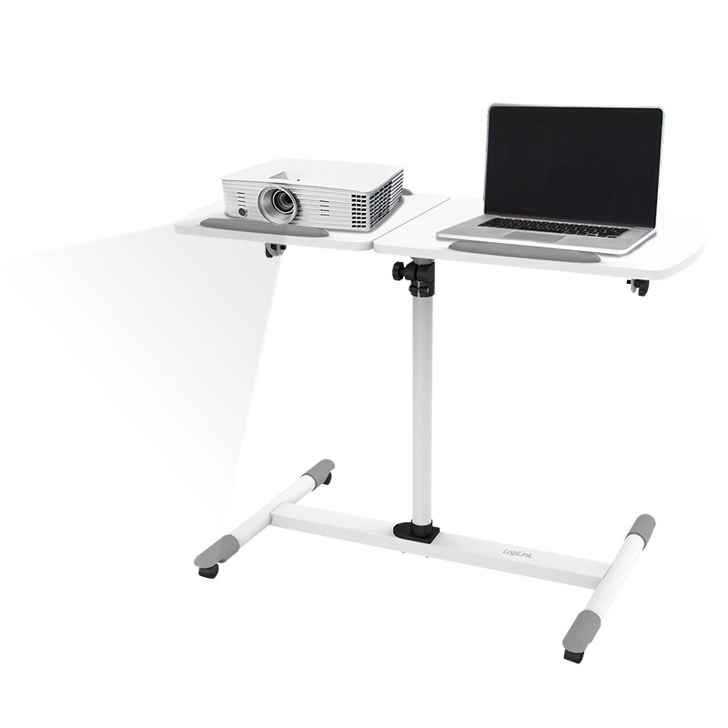 Table mobile universelle pour projecteur et ordinateur portable avec une capacité allant jusqu’à 10 kg, offrant un réglage en hauteur en continu, une inclinaison du plateau jusqu’à 35° et quatre roulettes pour un déplacement facile. La structure en acier stable et les butées antidérapantes maintiennent vos appareils en toute sécurité lors des présentations comme en position assise ou debout.