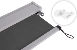 Fixation inférieure :Grâce aux composants supplémentaires et aux sangles élastiques situées au bord inférieur du store, vous pouvez fixer l’extrémité du store déroulé au mur. Cette fonction assure la stabilité, en particulier par temps venteux.