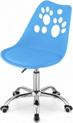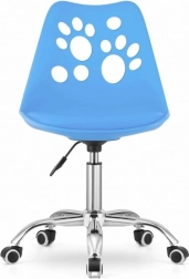 Chaise pivotante bleue en plastique avec base métallique et découpes décoratives en forme de patte, idéale pour les bureaux à domicile ou les chambres d’enfants.