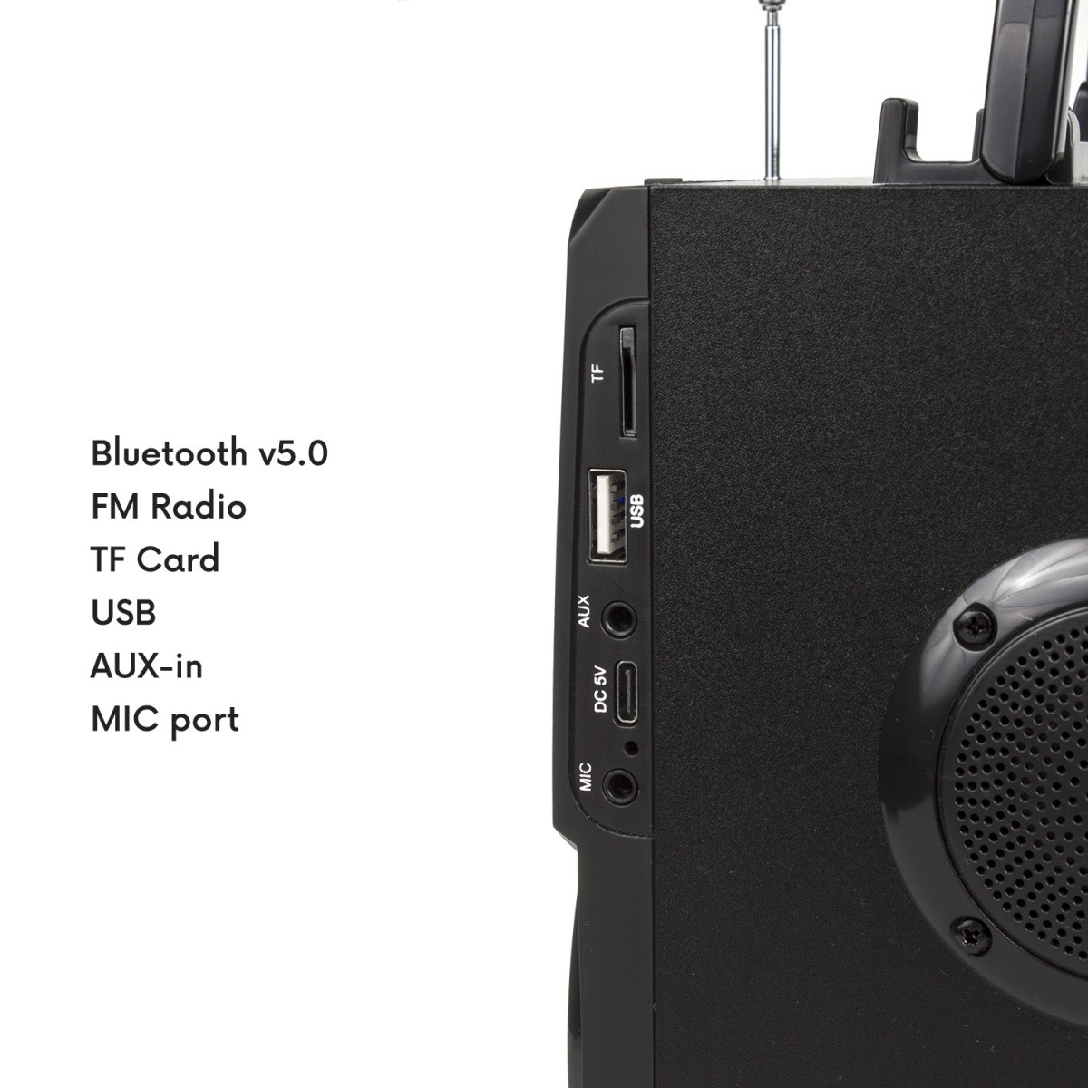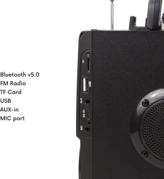 Idéal à transporter et à utiliser partout – Une poignée pratique pour un transport facile et des dimensions compactes rendent le haut-parleur adapté aussi bien à l’intérieur qu’à l’extérieur. Le haut-parleur est alimenté par des batteries d’une capacité de 2000 mAh, offrant 3 à 4 heures d’utilisation, avec une recharge aisée via câble USB (5 V, 1 A).