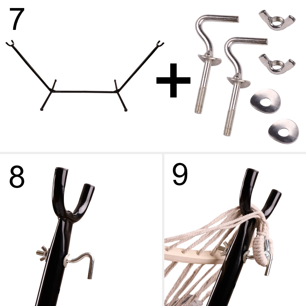 La barre d’écartement en bois facilite l’installation et la sortie et maintient la surface de couchage bien ouverte. Le set comprend en plus les outils de montage et un sac de transport avec poignées, pour déplacer ou ranger le hamac facilement. Idéal pour le jardin, la terrasse et les grands balcons – sans perçage et sans compromis.