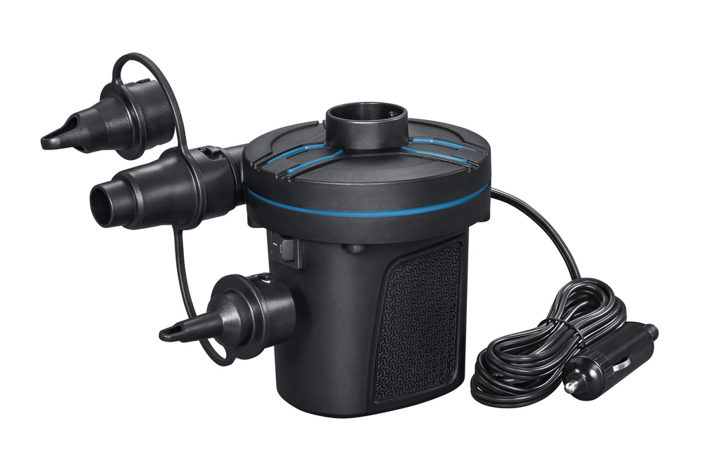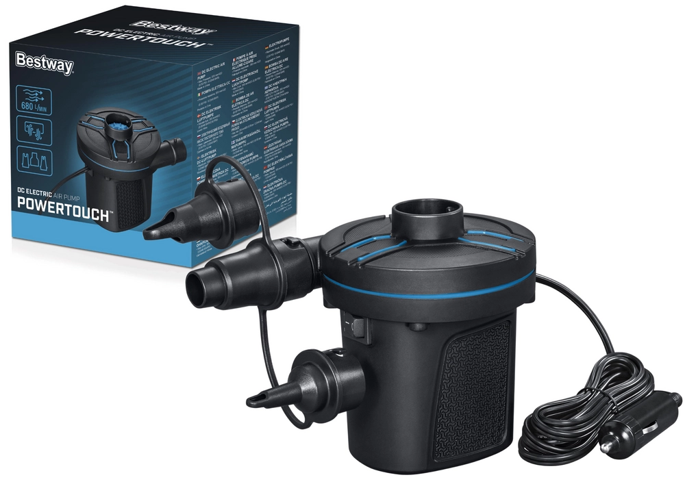 Pompe électrique 12V Bestway est parfaite pour le gonflage rapide des matelas, vélos ou ballons de plage. Grâce aux embouts interchangeables, elle est idéale pour tous les types de produits gonflables.