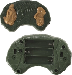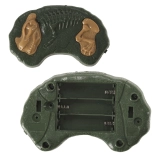 Télécommande en forme de fossile avec deux boutons : l’un pour la marche et le mouvement des pattes, l’autre pour les lumières, le son et les mouvements de tête.