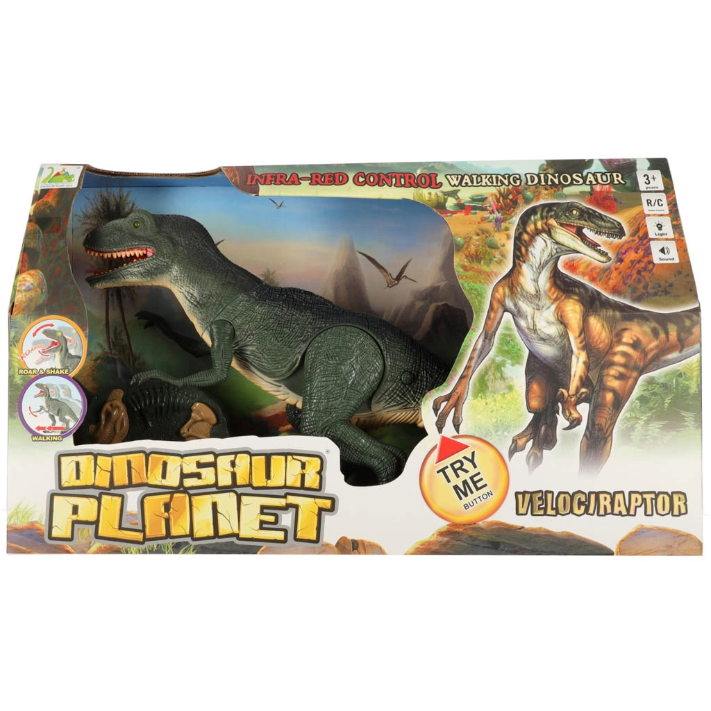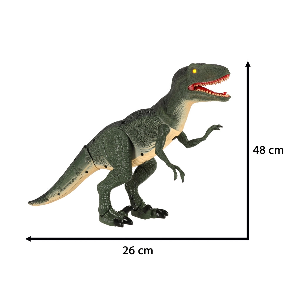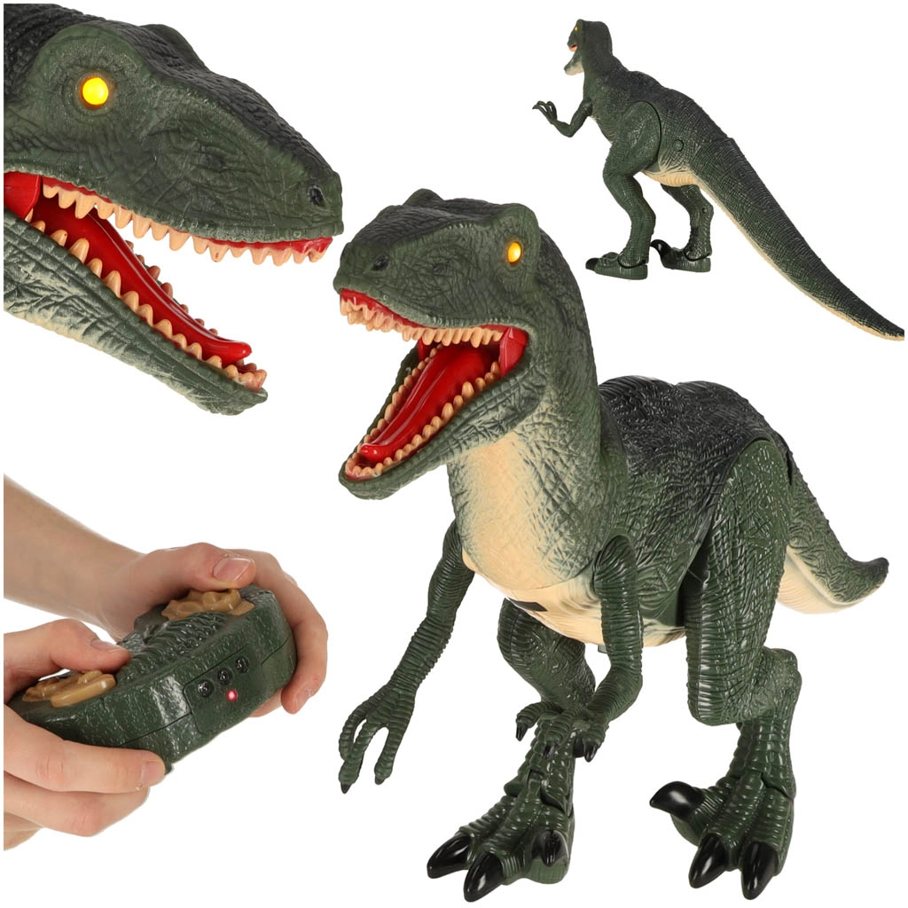 Découvrez le plaisir avec le dinosaure interactif VELOCIRAPTOR télécommandé. Ce modèle réaliste peut se déplacer, émet un rugissement de dinosaure, possède des yeux rouges lumineux et des pattes et une tête mobiles. Il est livré avec une télécommande au design fossile avec deux fonctions pour marche, lumières et sons.