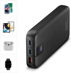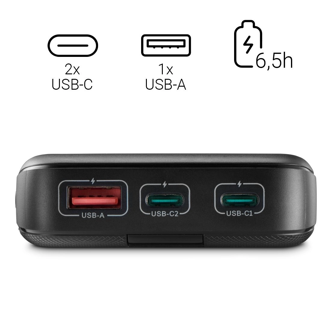 Notre batterie externe permet de recharger jusqu’à trois appareils à la fois grâce à deux ports USB-C et un port USB-A. Vous pouvez ainsi recharger en même temps votre téléphone, votre tablette et votre montre connectée, ce qui est très pratique en déplacement ou lors de journées chargées.