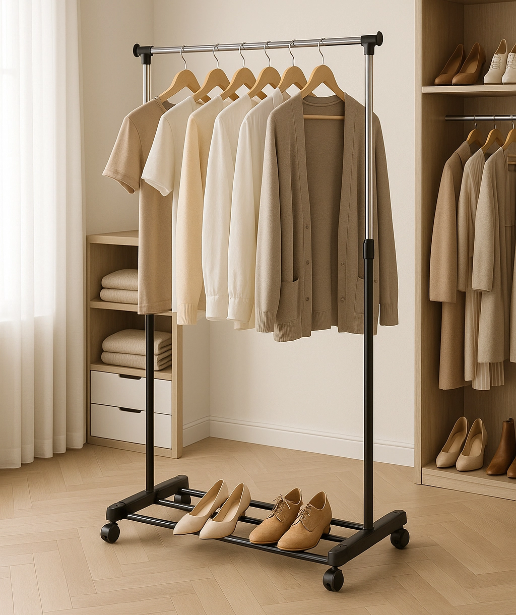 Le support de vêtements sur pied est une façon pratique de ranger vêtements et chaussures, ce qui en fait un excellent complément pour chaque dressing, chambre ou entrée de votre maison ou appartement. Grâce à son design universel, il s'harmonise avec les intérieurs modernes et classiques, fournissant ainsi non seulement une fonctionnalité, mais aussi une touche esthétique à votre décoration.