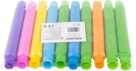 Les tubes sont disponibles en 7 couleurs : jaune, rose, violet, orange, bleu, bleu foncé et vert. Ils offrent une stimulation visuelle et tactile.
