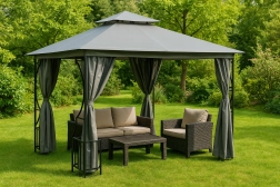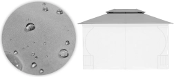 Toit double : Une ouverture de ventilation spéciale au sommet du toit améliore considérablement la circulation de l’air à l’intérieur de la tonnelle, aide à réduire l’accumulation de chaleur pendant les journées chaudes et empêche l’humidité de s’accumuler. L’ouverture aide également à atténuer la pression du vent lors de fortes rafales.