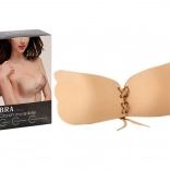 Soutien-gorge auto-adhésif discret de couleur beige avec laçage frontal pour un effet push-up réglable. Idéal sous les robes dos nu et les tops sans bretelles. Adhère parfaitement à la peau, rehausse et rapproche la poitrine et reste invisible sous les vêtements.