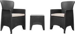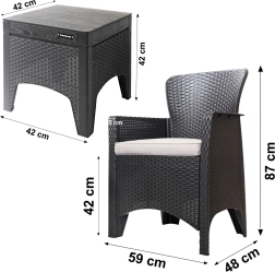 Cet ensemble de mobilier de jardin est un choix idéal pour toute terrasse ou balcon. Il comprend 2 fauteuils et une table avec une structure en polypropylène résistant et une surface à effet rotin synthétique. Le set est équipé de coussins de 5 cm d’épaisseur et est résistant aux intempéries, garantissant une longue durée de vie et un entretien facile.