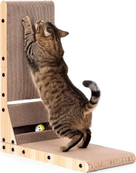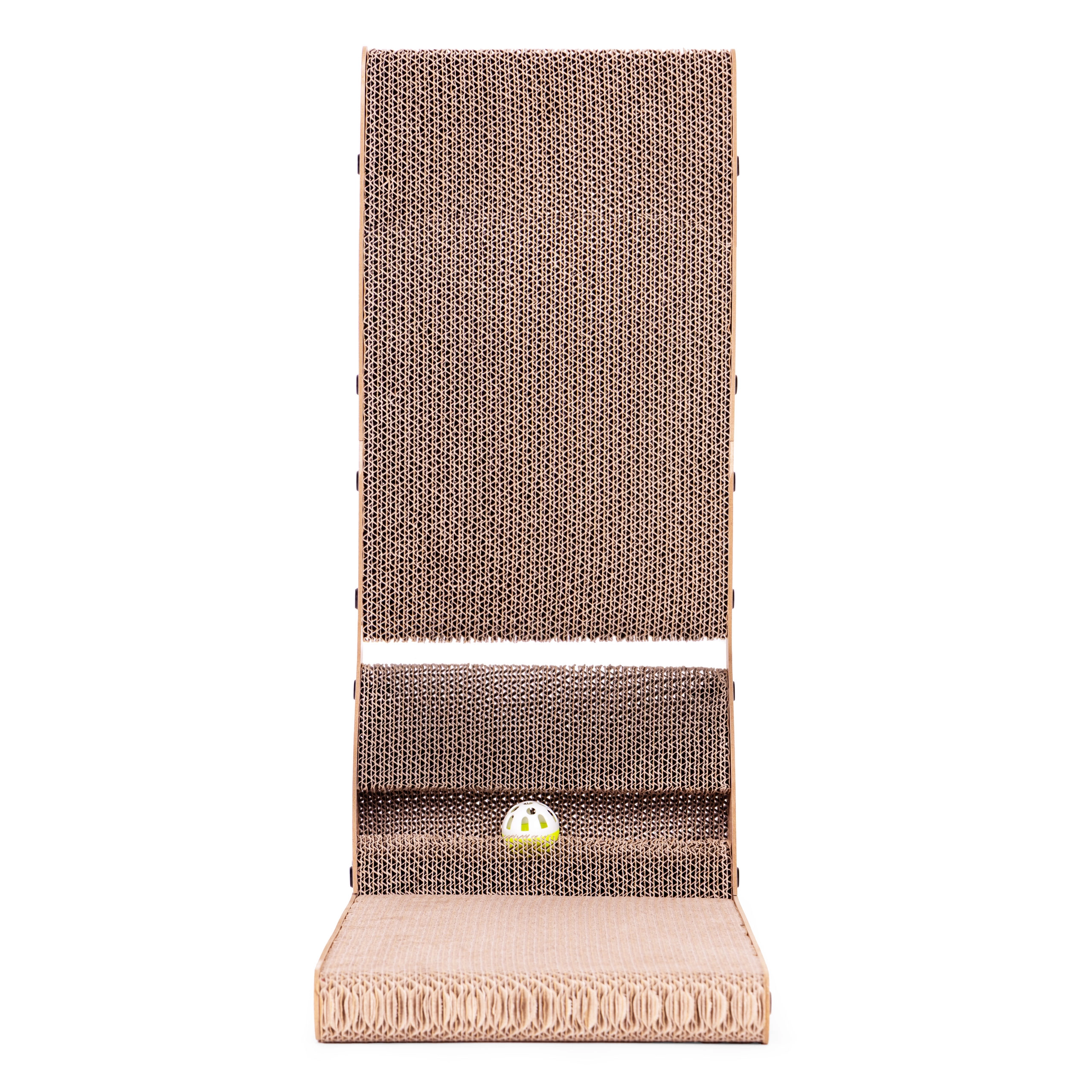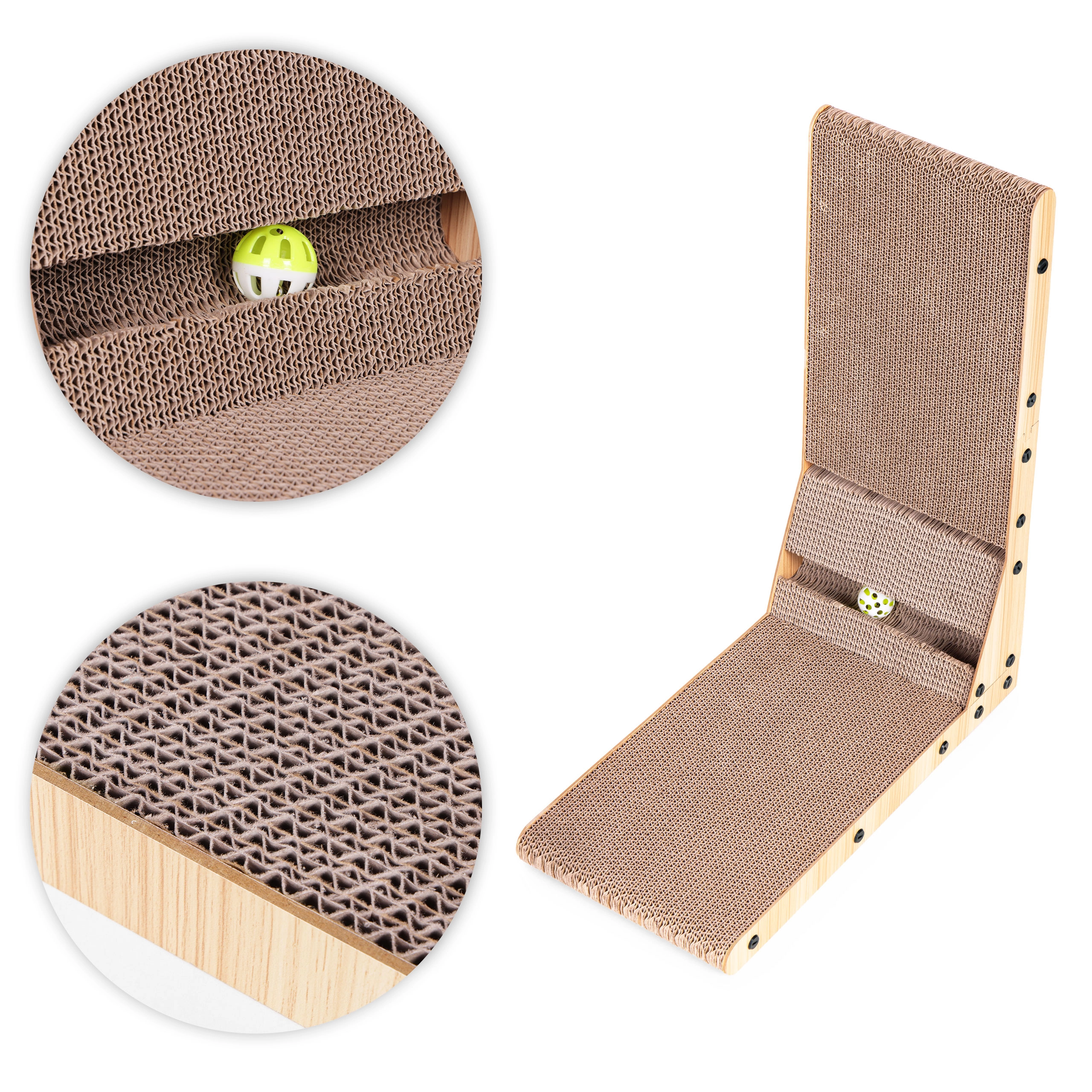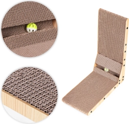 • Le griffoir est fabriqué en carton stratifié résistant, idéal pour aiguiser les griffes. La texture du carton attire naturellement les chats, tandis que la stabilité et la robustesse du griffoir sont assurées par un cadre en MDF.
