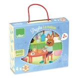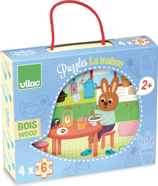 Découvrez les puzzles en bois de qualité VILAC sur le thème de la maison, idéals dès 2 ans. Le coffret comprend 4 puzzles séparés de 6 pièces dans un pratique coffret en bois avec poignée en coton. Un excellent choix pour développer la motricité fine, la logique et la concentration des enfants.