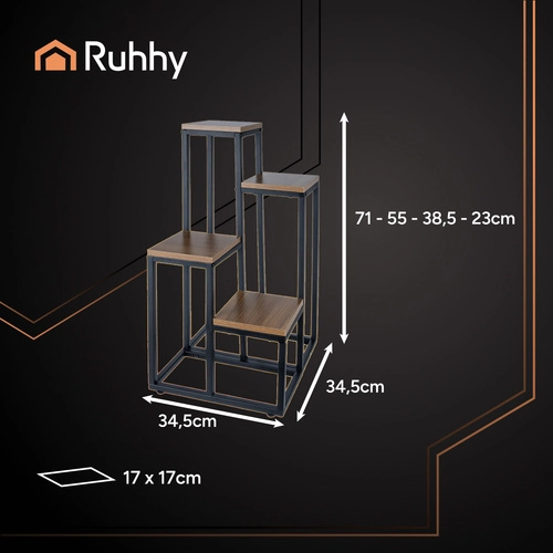 Le support de fleurs debout stylé RUHHY est une construction à quatre niveaux qui permet d'exposer plusieurs plantes sur un espace réduit. Design moderne avec cadre en métal et étagères en bois convient à tout intérieur. La structure stable et robuste peut supporter jusqu'à 50 kg de charge et est équipée d'une protection de sol grâce à des pieds niveleurs.