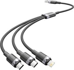 Profitez d’une charge sûre et efficace avec un câble USB qui réunit trois connecteurs différents dans un format pratique. Sa construction robuste comprend des conducteurs en cuivre étamé, un blindage multicouche et une gaine tressée en coton et PVC. Les connecteurs sont nickelés et les coques en aluminium offrent une résistance aux pliures.