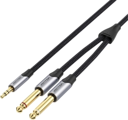 Câble audio adaptateur de Vention, qui permet de convertir un signal stéréo depuis un connecteur 3,5 mm vers deux connecteurs mono 6,35 mm, idéal pour la connexion à une table de mixage ou à des enceintes actives. Grâce à ses connecteurs plaqués or et à son conducteur en cuivre étamé, il assure un son pur sans interférences.