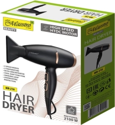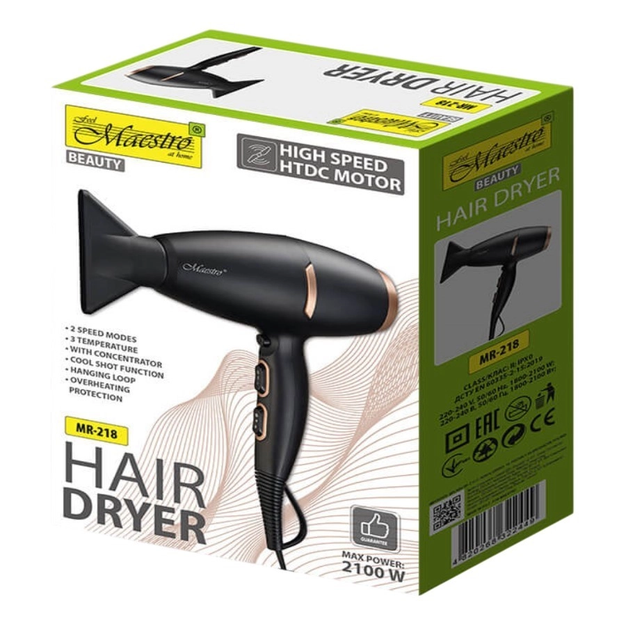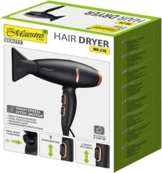 Le sèche-cheveux Maestro est équipé de deux concentrateurs pour un coiffage précis et pour diriger le flux d’air là où c’est le plus nécessaire. Il propose deux vitesses de soufflage et trois réglages de température, permettant d’adapter son fonctionnement aux besoins individuels et au type de cheveux.