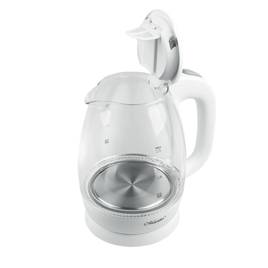 La bouilloire Maestro offre un éclairage bleu pendant l’ébullition, conférant un aspect moderne à la cuisine. Le couvercle à ouverture facile et l’indicateur de niveau d’eau facilitent le remplissage et le contrôle du contenu. Grâce à sa base rotative à 360°, la bouilloire convient aussi bien aux droitiers qu’aux gauchers, et le range-câble intégré aide à garder un plan de travail ordonné.