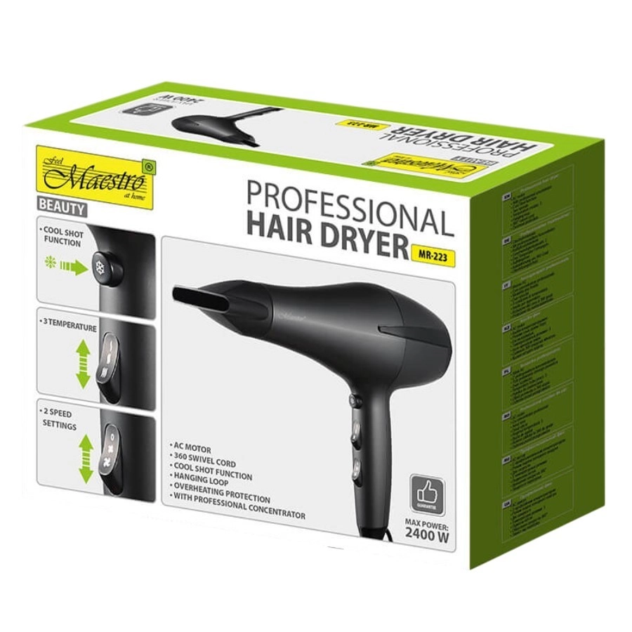 Le sèche-cheveux Maestro 2400W est conçu pour répondre à vos besoins quotidiens en matière de soin des cheveux. Avec cet appareil, vous bénéficiez d’un flux d’air puissant et stable qui s’adapte à toutes les longueurs et densités de cheveux.