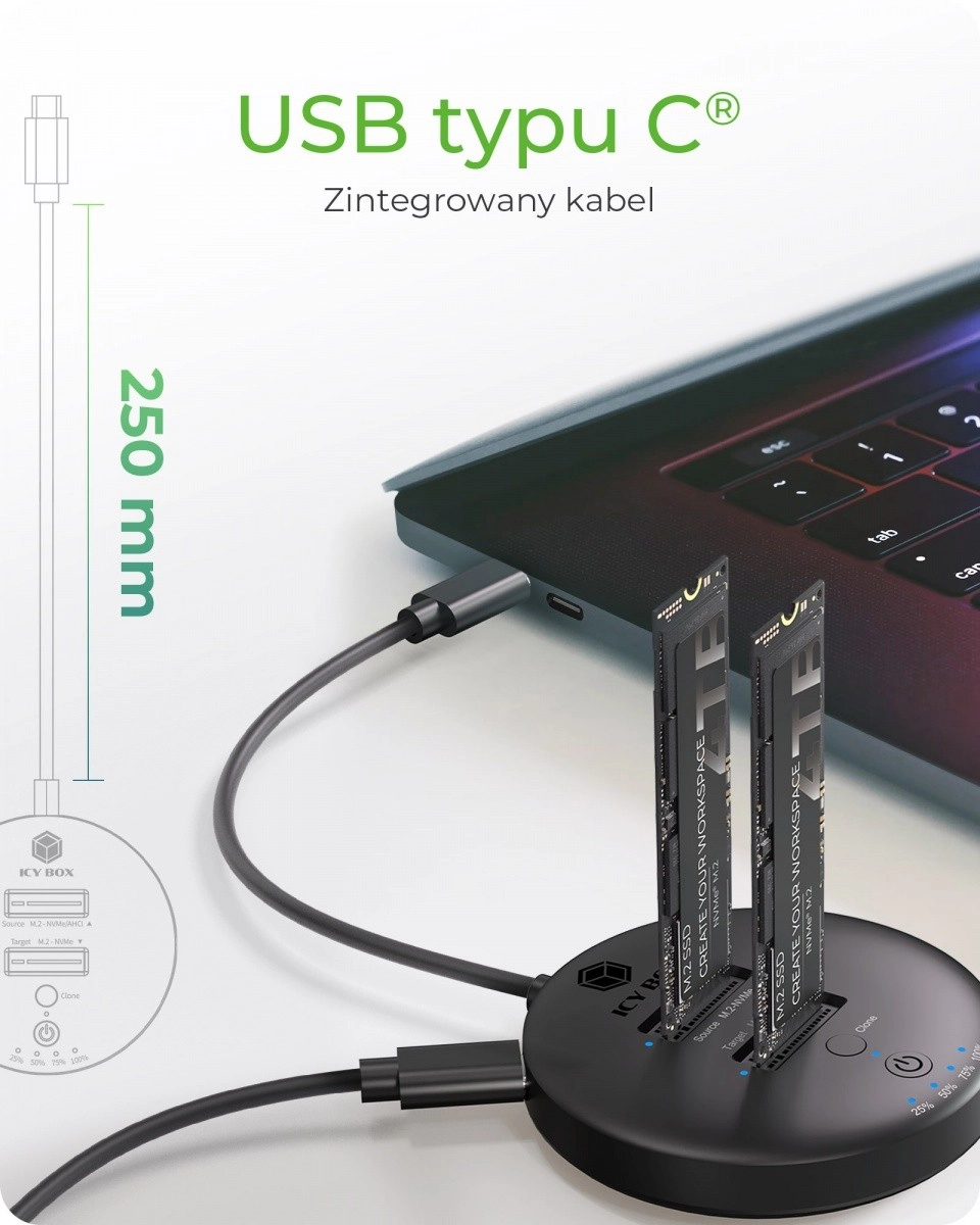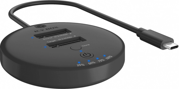 La station IB-1612MCL-C31 vous permet le clonage autonome des disques sans connexion à un ordinateur. Dupliquez facilement un SSD M.2 NVMe entier pour une migration système rapide. Des indicateurs LED affichent clairement l’avancement du clonage.