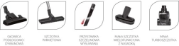 L’aspirateur cyclonique est équipé d’une chambre spéciale CYCLONE SUCTION qui crée des cyclones séparant les particules de poussière de l’air en circulation. L’appareil comprend également un filtre en mousse, un filtre conique et deux filtres HEPA 13 capturant 99,98 % des impuretés. Après le nettoyage, il suffit de vider le réservoir à poussière d’une capacité de 1,1 litre.