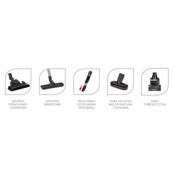 Équipement de l’aspirateur : l’ensemble comprend une tête pour sols et tapis, une brosse pour parquet, une petite turbo-brosse, un suceur fente télescopique et une petite brosse multifonction avec embout.
