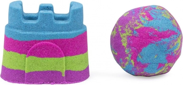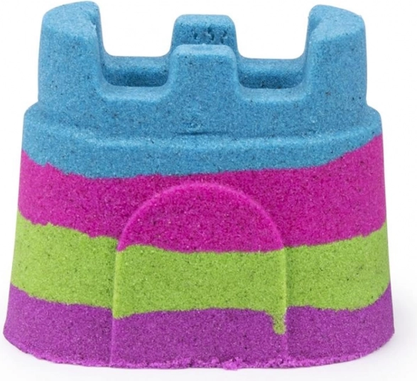 La version Mini Château arc-en-ciel contient 140 g de sable en quatre couleurs (bleu, vert, violet, rose). Le gobelet en forme de château fait office à la fois de moule de construction et de rangement pratique – après le jeu, rangez simplement le sable à l’intérieur et il sera prêt pour la prochaine séance créative.