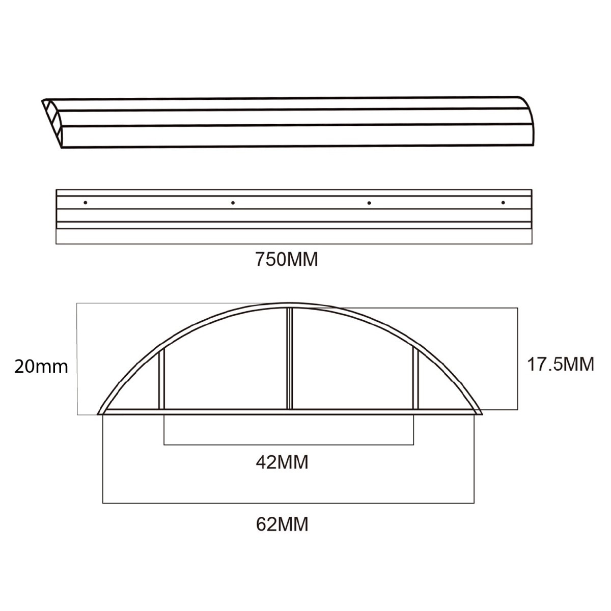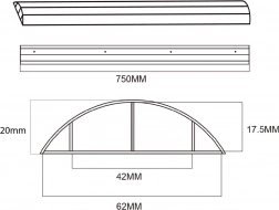 750 mm (longueur) x 20 mm (hauteur) x 17,5 mm (profondeur)