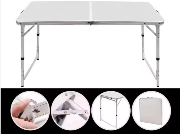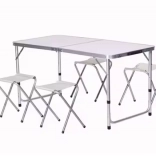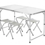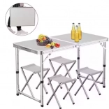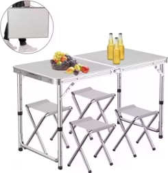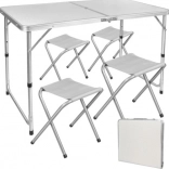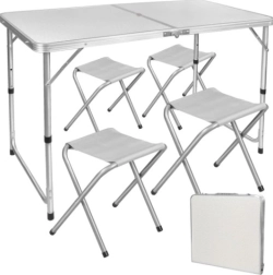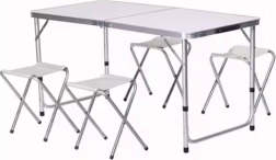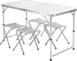 L'ensemble comprend une table légère mais solide et quatre chaises confortables, idéales pour le camping, au chalet, au jardin, sur le balcon ou la terrasse. Le design moderne avec plateau blanc et cadre en aluminium argenté s'adapte parfaitement à tout environnement, de la nature à l'espace organisé de la maison. Cet ensemble simplifie non seulement l'organisation des activités de plein air, mais économise également de l'espace – une fois plié, il peut être facilement rangé dans une armoire, un garage ou sous le lit.