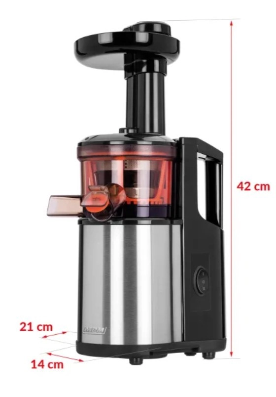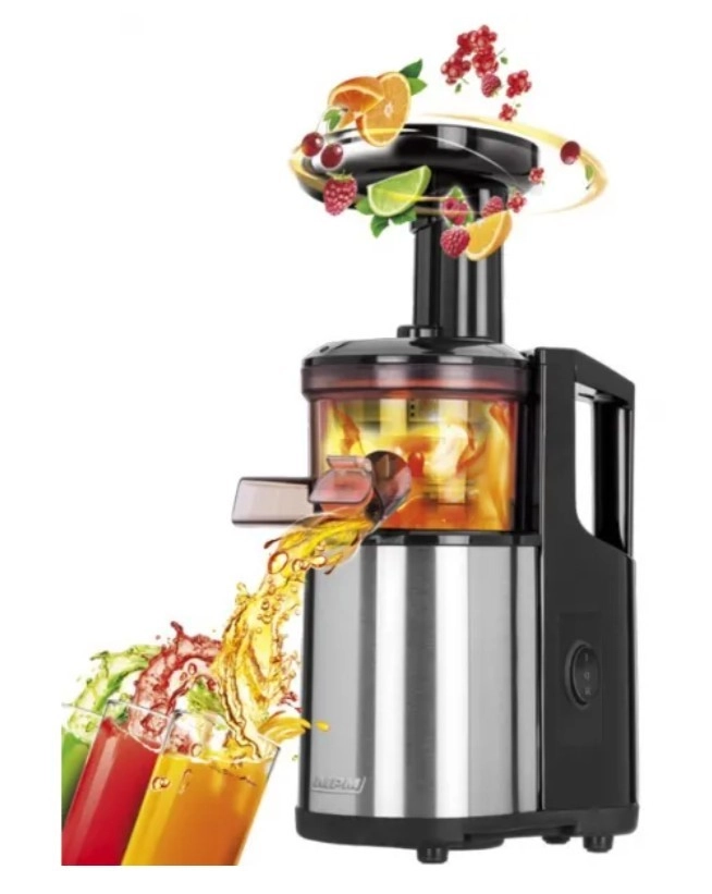 L’appareil fonctionne à basse vitesse (60 tr/min), ce qui assure un pressage précis et uniforme. La vis interne garantit une extraction lente et exacte sans échauffement excessif ni moussage du jus. Il permet d’obtenir une boisson à partir de la plupart des types de légumes, fruits et herbes, y compris ceux qui ne peuvent pas être traités par un extracteur standard, comme le persil, les épinards, la laitue, l’herbe de blé, les framboises, le cassis, l’ananas, la mangue et bien d’autres.