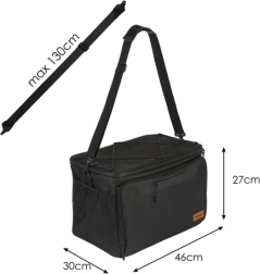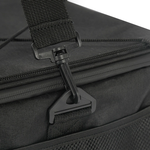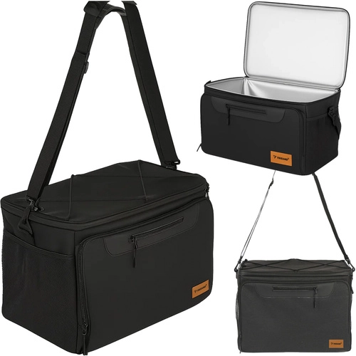 Les paramètres techniques du sac incluent des dimensions de 46 × 27 × 30 cm et sa couleur noire. La surface extérieure est en tissu Oxford, tandis que l’intérieur est recouvert d’une feuille d’aluminium combinée à du tissu Oxford.