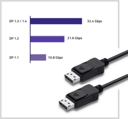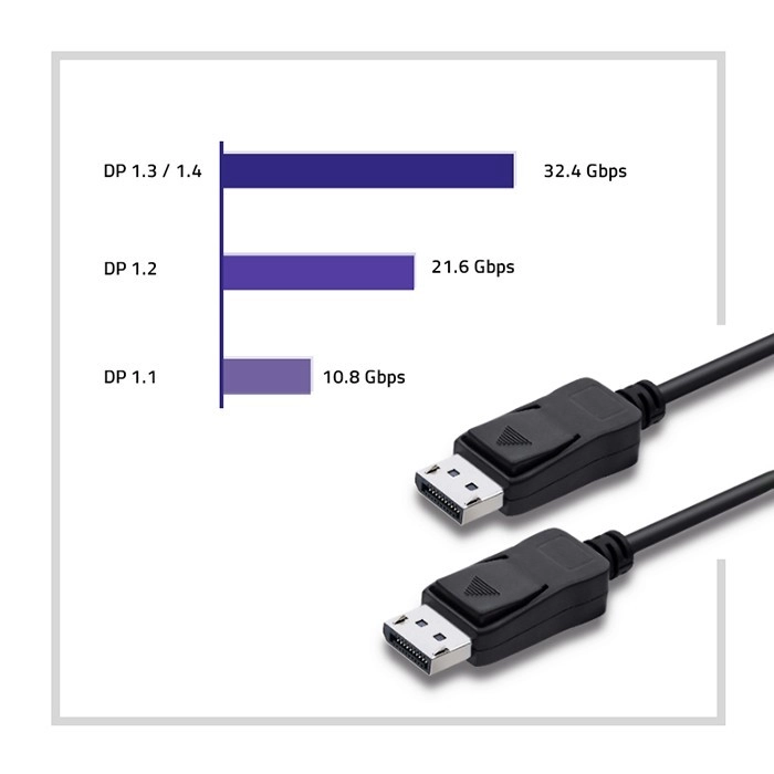 Le câble DisplayPort 1.4 représente une avancée technologique permettant une bande passante de 32,4 Gb/s, ce qui permet le support du 8K à 60 Hz (uniquement avec DSC). Même sans DSC, il offre une meilleure qualité d'image grâce à la HDR. Sa capacité de multidiffusion soutient plusieurs moniteurs à l'aide d'un seul câble.